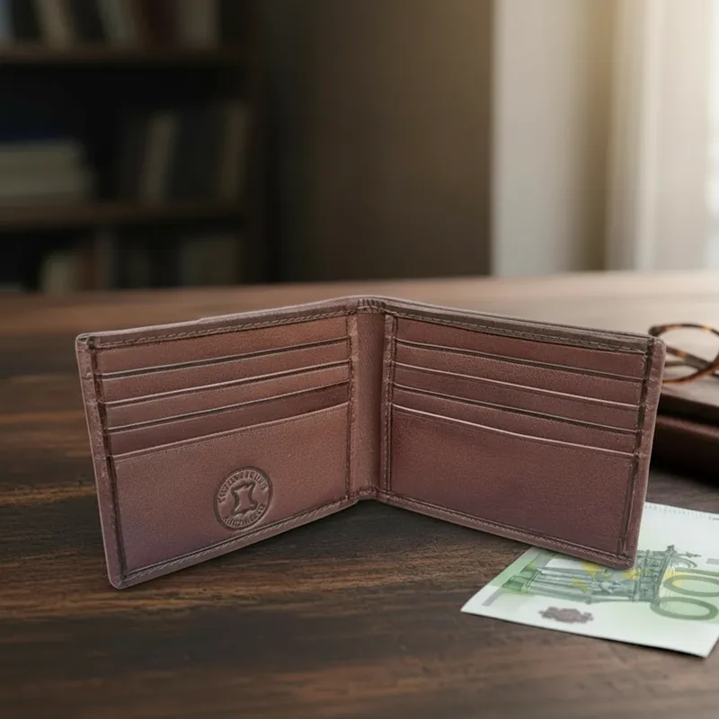 El cuero se adapta con el tiempo, ganando elasticidad natural. Al principio puede parecer ajustado, pero luego se amolda perfectamente a billetes y tarjetas.