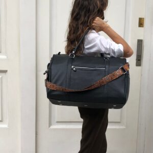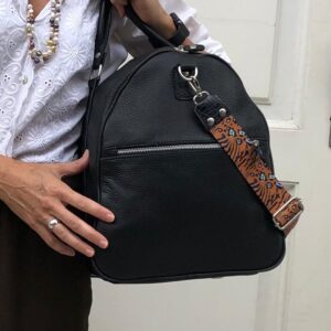 Bolso en cuero negro. Tres bolsillos con cierre externos, uno interno. Totalmente forrado. Patines en la base. Correa regulable y extraible en cinta con terminales en cuero. Cuero softy y suave al tacto.