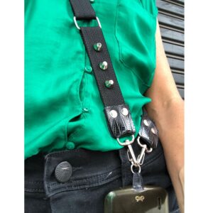Correa con accesorio de aplique porta celular.