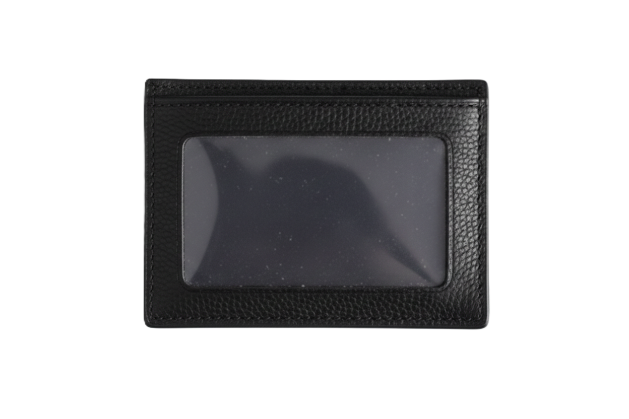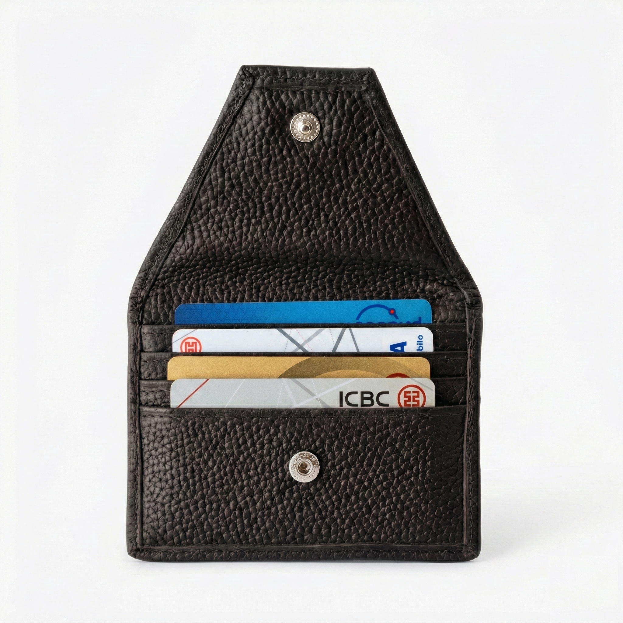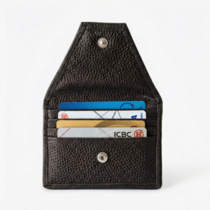 Tarjetero de cuero. Visor en la espalda y solapa con broche. Súper practico.